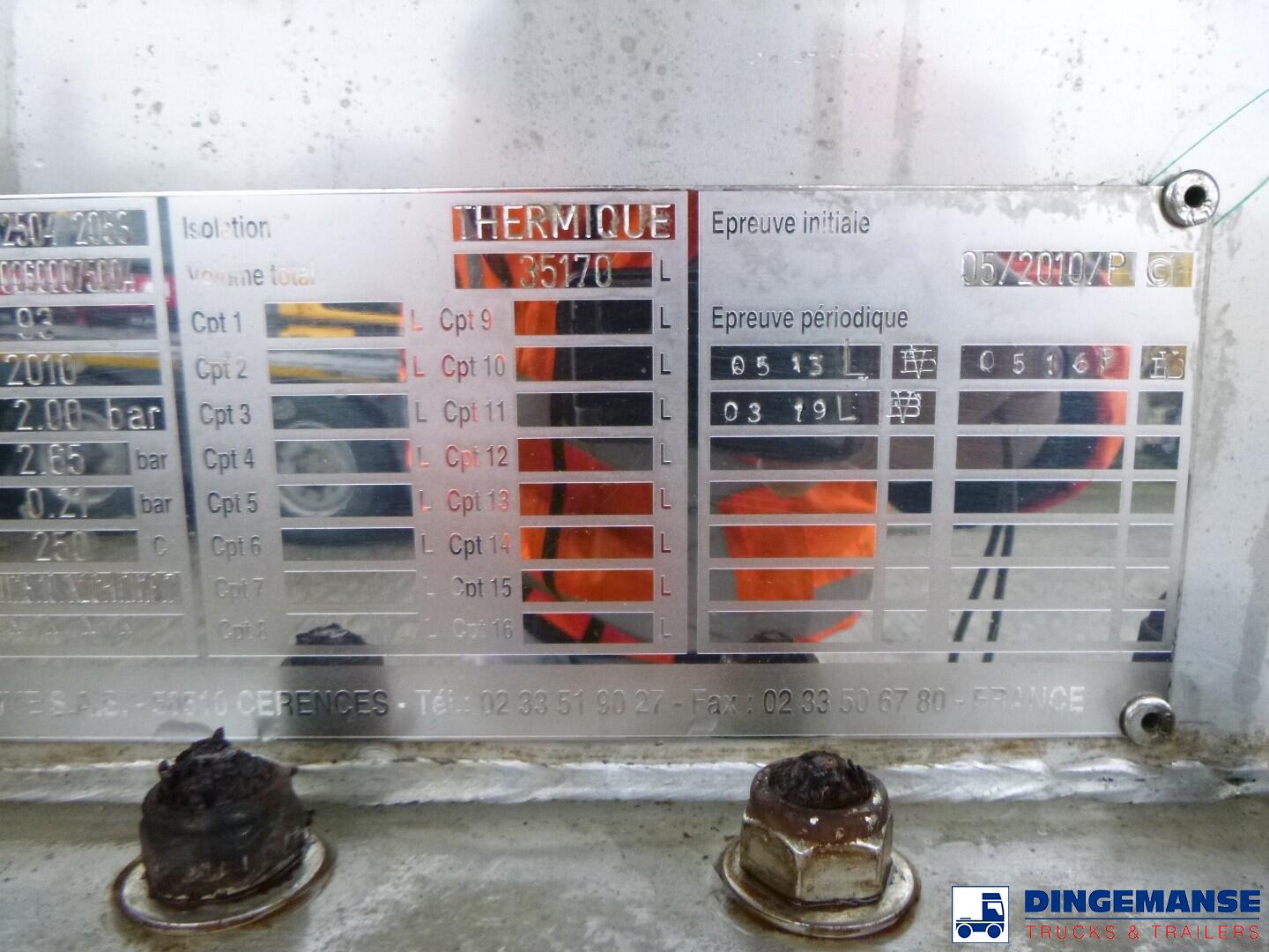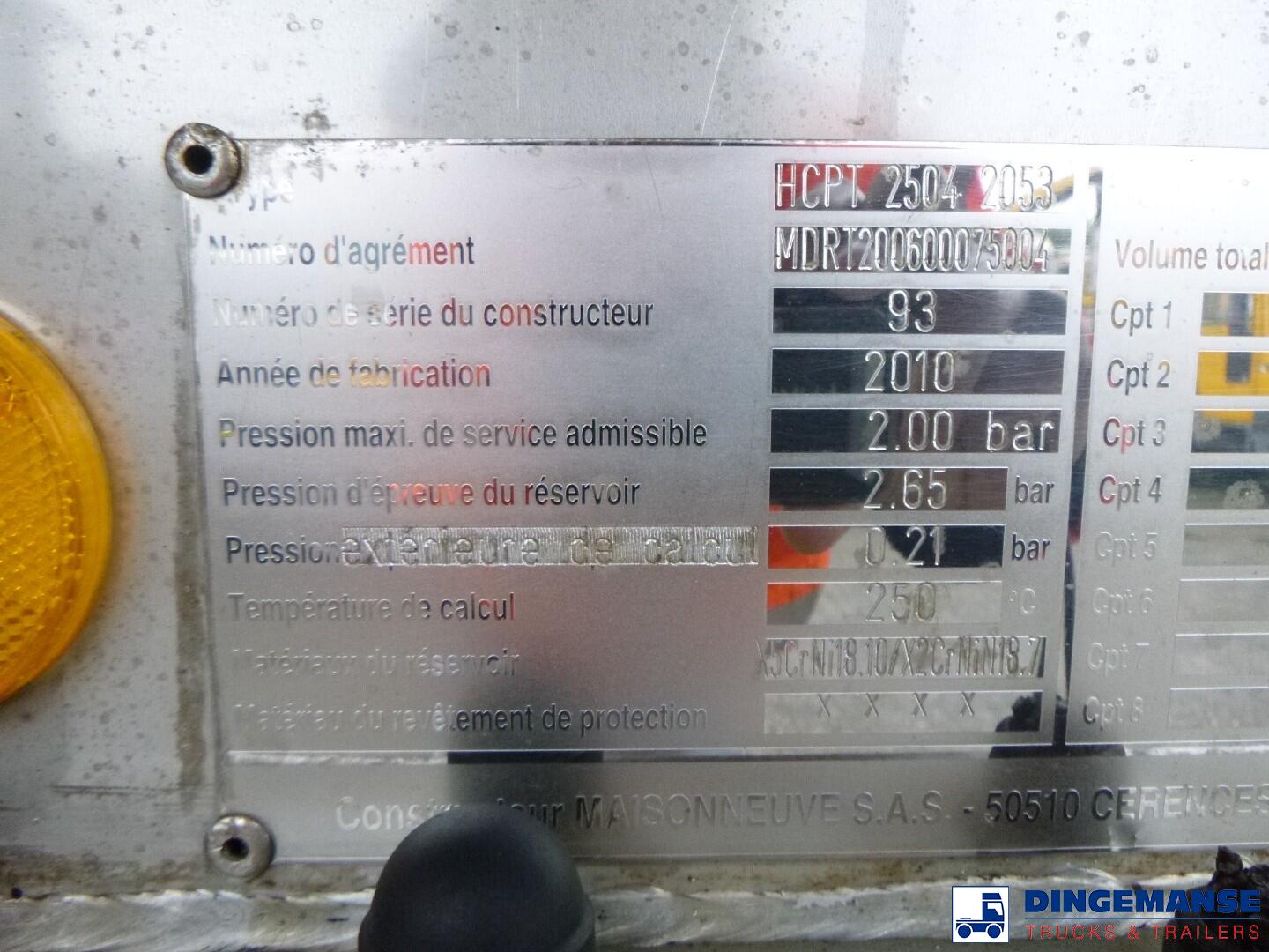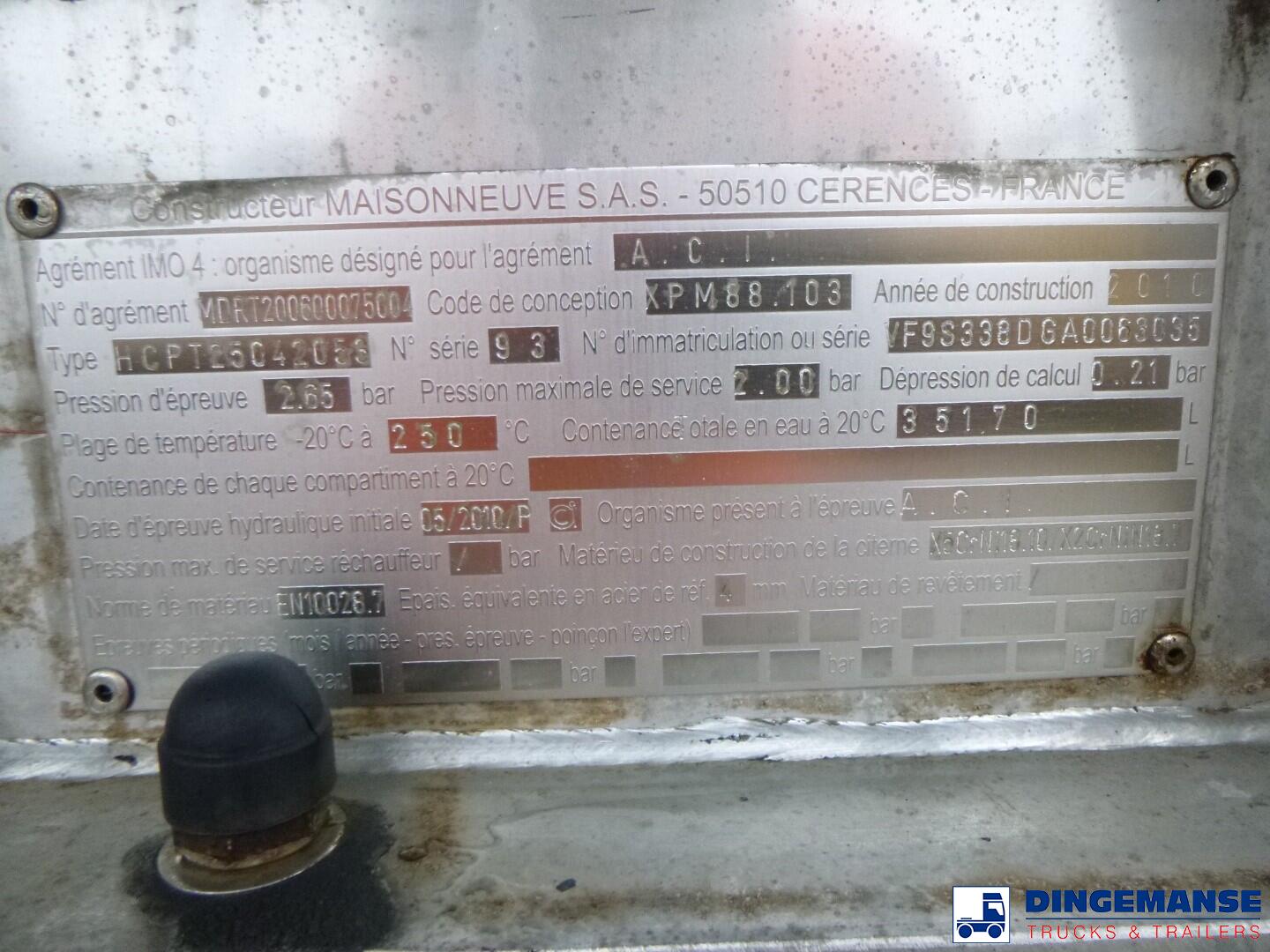 Insulated Maisonneuve stainless steel bitumen tank, Capacity 35170 liters, 1 Compartment, Tank material code EN 10028.7, Test pressure 2.65 bar, Max working pressure 2.0 bar // Air suspension, Lift axle, Alloy wheels, Mercedes axles, ABS, Disc brakes, Shipment dimensions 1185x250x360 cm