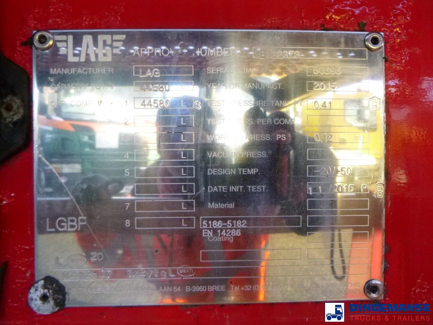 NON-EU VEHICLE, REQUIRES CUSTOMS CLEARANCE // L.A.G. aluminium jet fuel tank, Capacity 44580 liters, 1 Compartment, Year of construction 2015, Tank material code 5186-5182 / EN 14286, Test pressure 0.41 bar, Max working pressure 0.12 bar, Hydraulic discharge pump Blackmer, Vapour recovery, Overload sensor, Air suspension, Drum brakes, BPw Eco Plus axles, Alloy wheels, ABS, Shipment dimensions 1230x250x360 cm