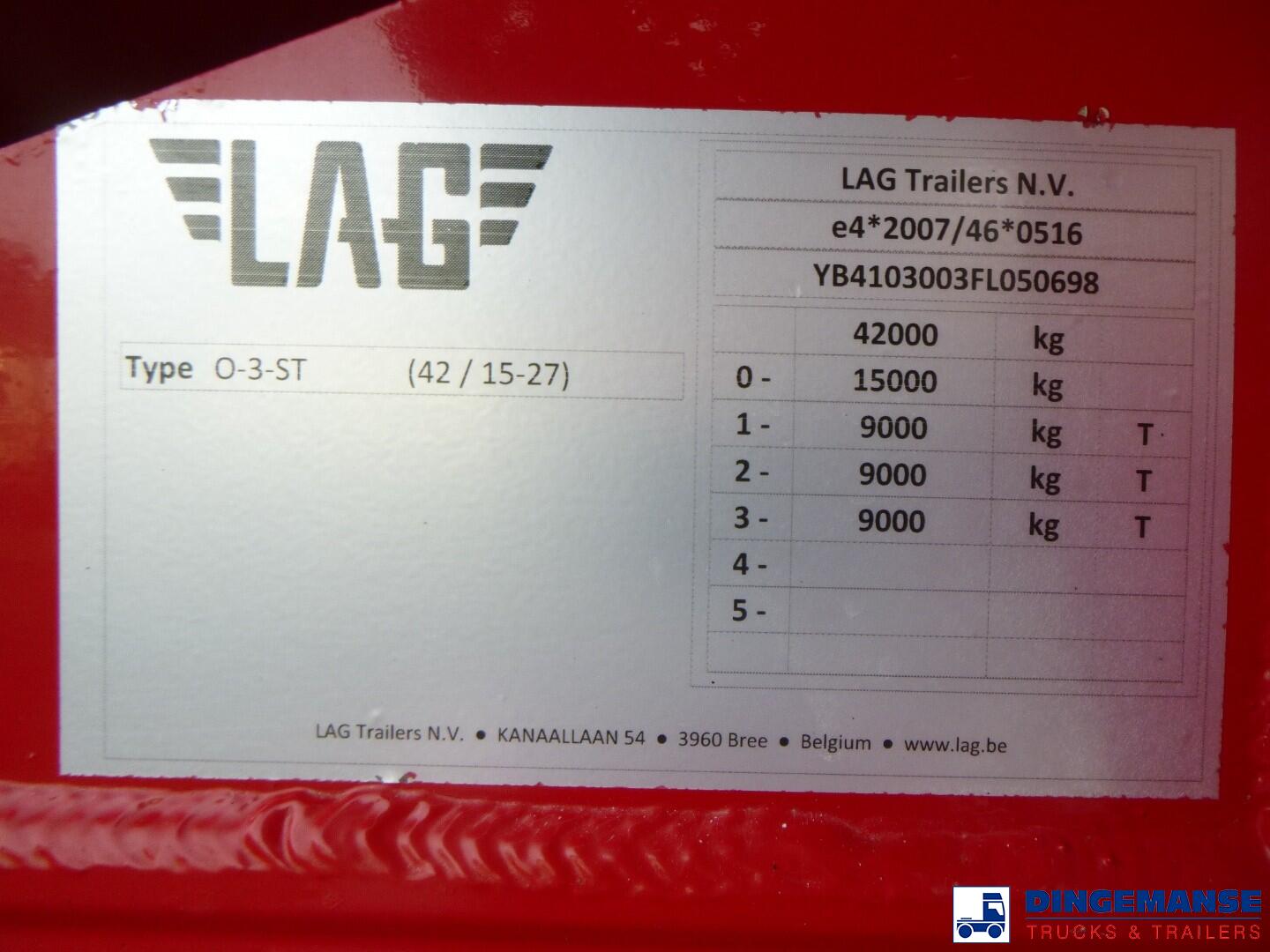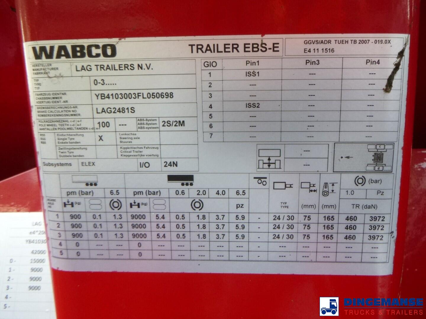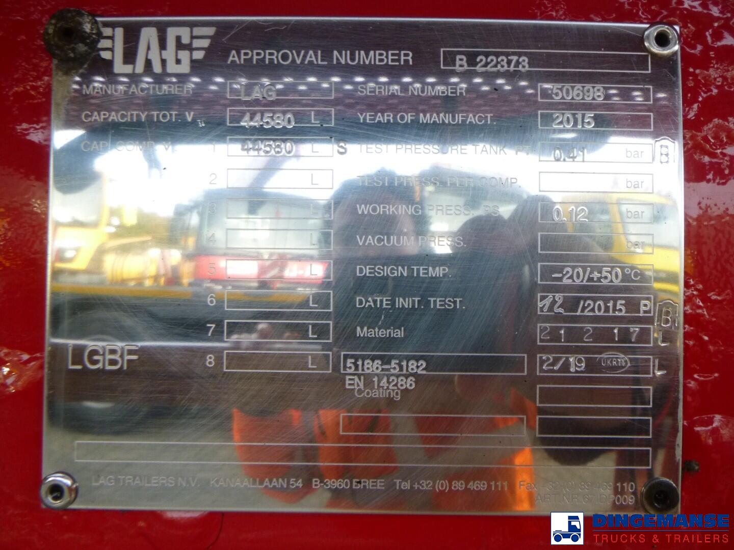 NON-EU VEHICLE, REQUIRES CUSTOMS CLEARANCE // L.A.G. aluminium jet fuel tank, Capacity 44550 liters, 1 Compartment, Year of construction 2015, Tank material code 5186-5182 / EN 14286, Test pressure 0.41 bar, Max working pressure 0.12 bar, Hydraulic discharge pump Blackmer, Vapour recovery, Overload sensor, Air suspension, Drum brakes, BPw Eco Plus axles, Alloy wheels, ABS, Shipment dimensions 1230x250x360 cm