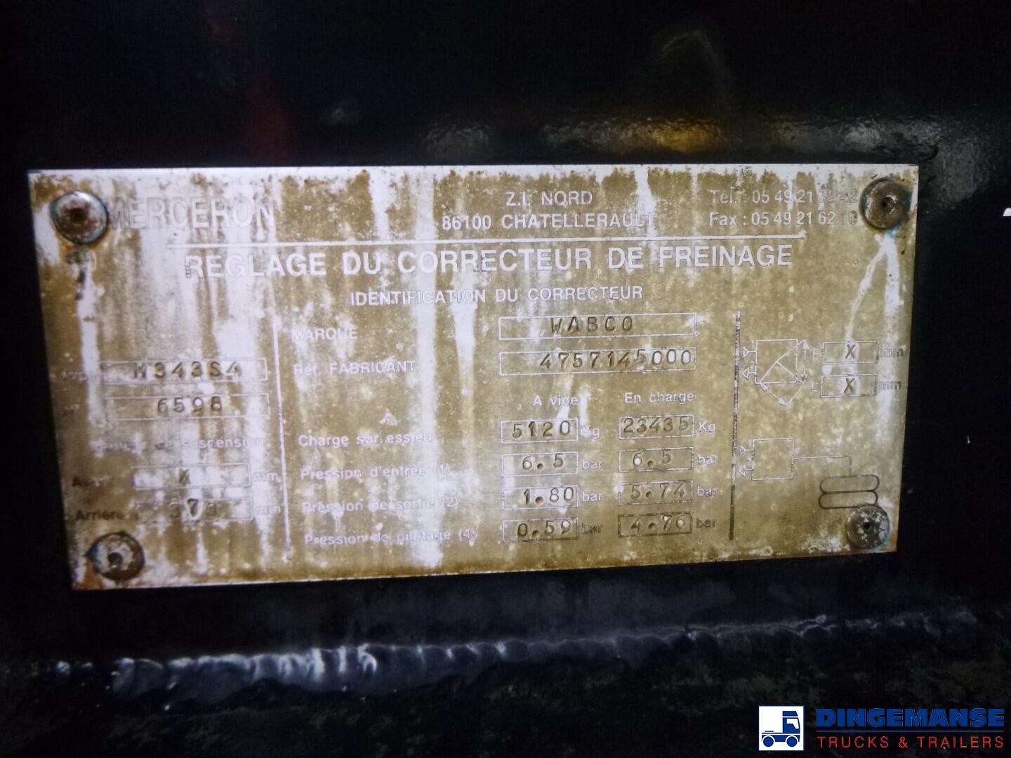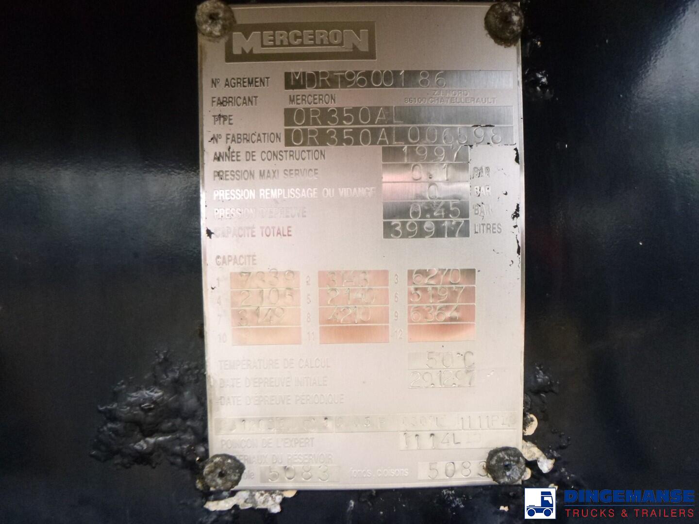 Merceron aluminium fuel tank, Capaciry 39917 liters, 9 Compartments (7339; 3143; 6270; 2105; 2140; 5197; 3149; 4210; 6364), Year of construction 1997, Tank material code 5083, Test pressure 0.45 bar, Max working pressure 0.1 bar, Vapour recovery, Overload sensor, Air suspension, Drum brakes, ABS, SAF axles, lift axle, Shipment dimensions 1275x250x360 cm