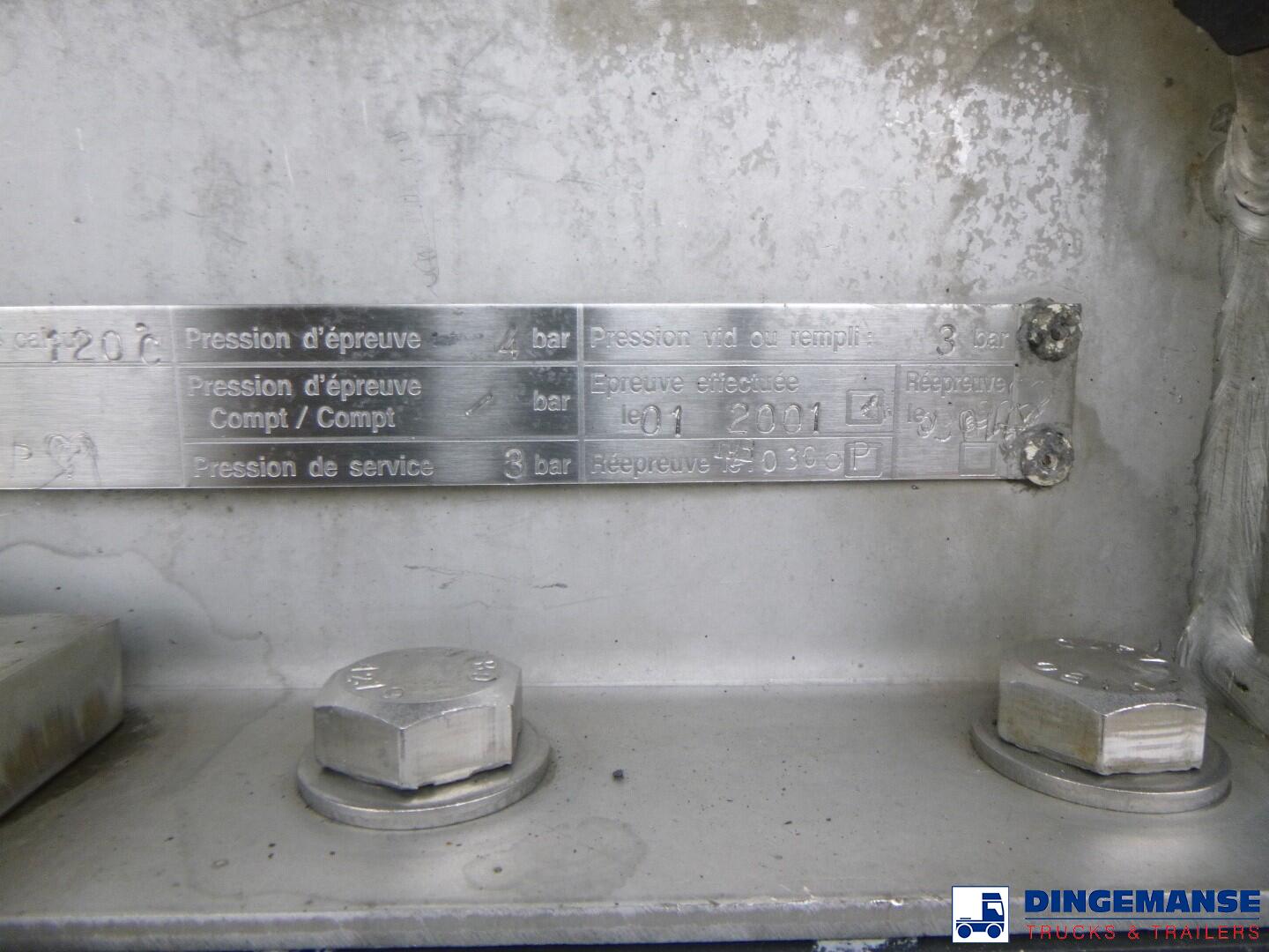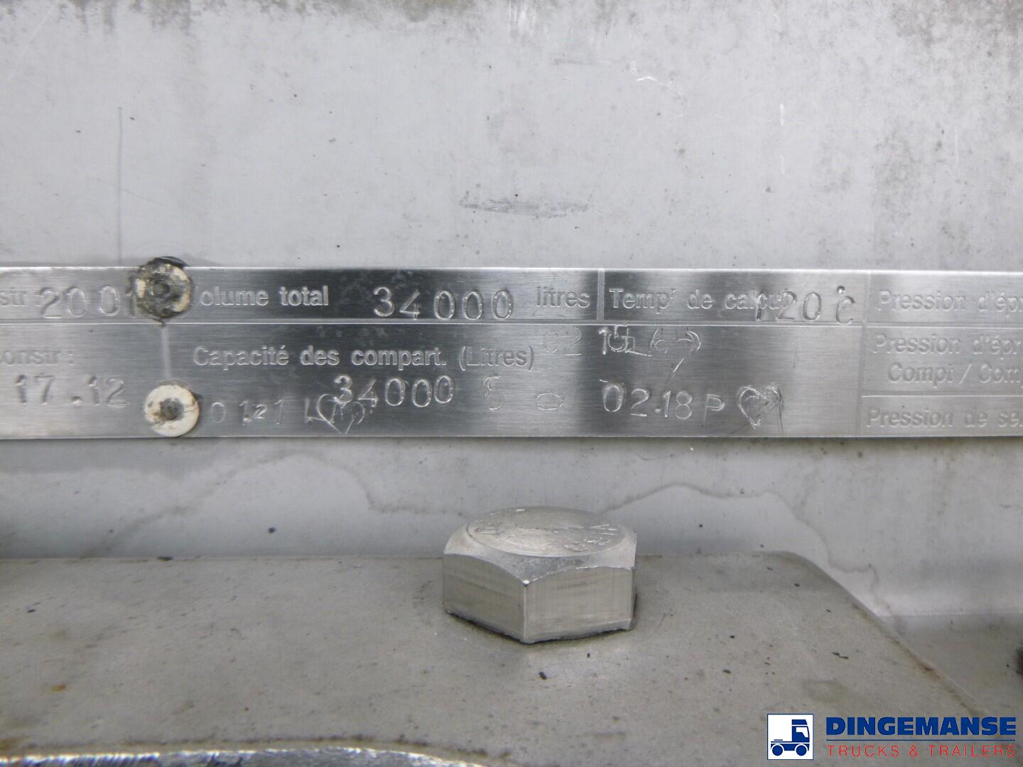 Insulated stainless steel (inox) chemical tank, Capacity 34000 liters, 1 Compartment, Year of construction 2001, Tank material code Z6CNDT 17.12, Test pressure 4.0 bar, Max working pressure 3.0 bar, Steam heating, Air suspension, Disc brakes, Saf axles, ABS, Alloy wheels, Shipment dimensions 1240x250x360 cm