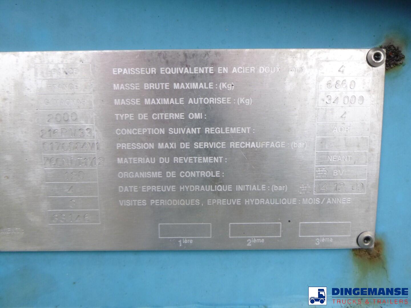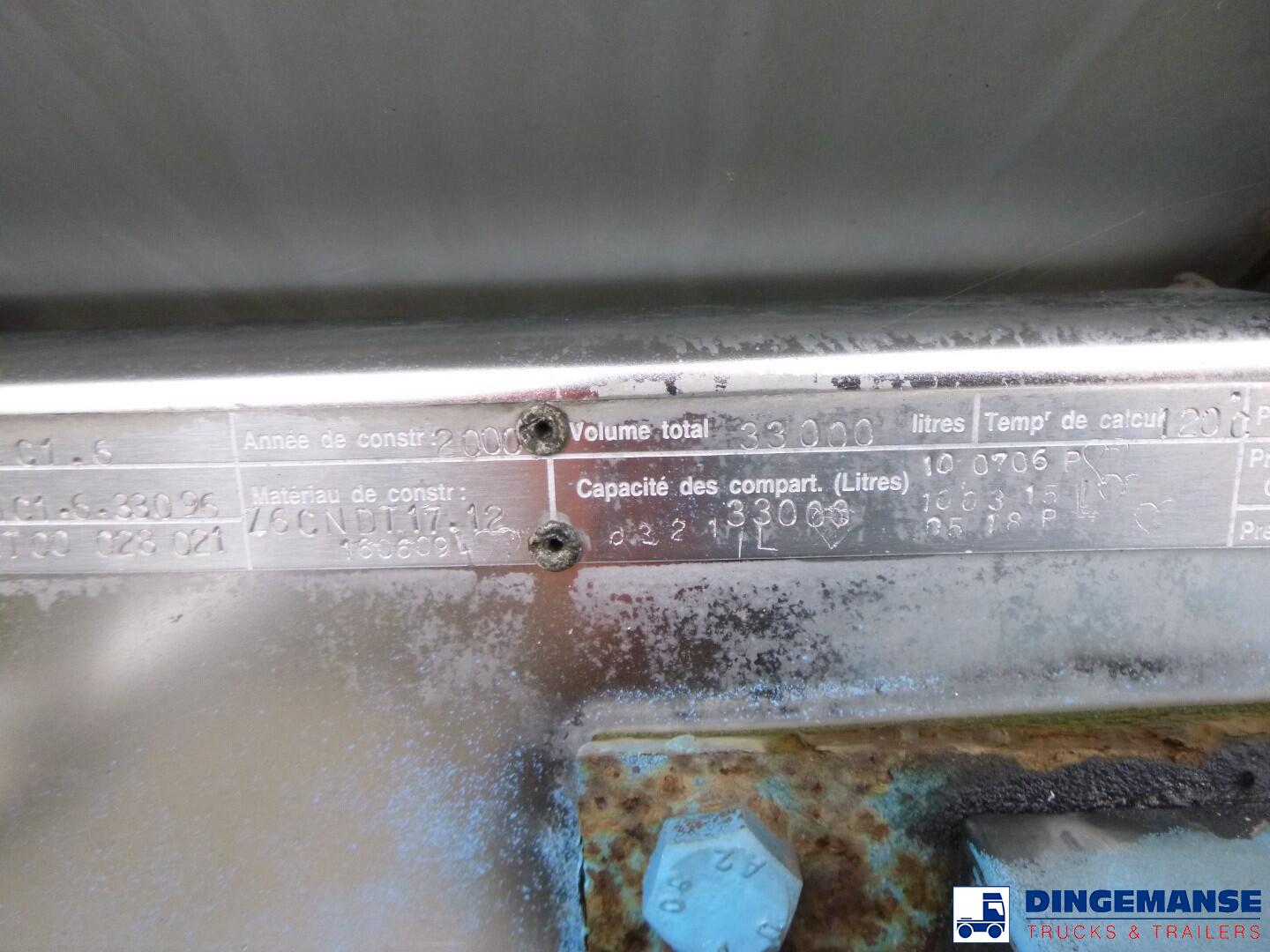 Insulated stainless steel chemical tank, Capacity 33146 liters, 1 Compartment, Year of construction 2000, Tank material code Z6CNDT 17.12, Test pressure 4.0 bar, Max working pressure 3.0 bar, Air suspension, SAF axles, Disc brakes, ABS, Alloy wheels, Shipment dimensions 1265x250x360 cm