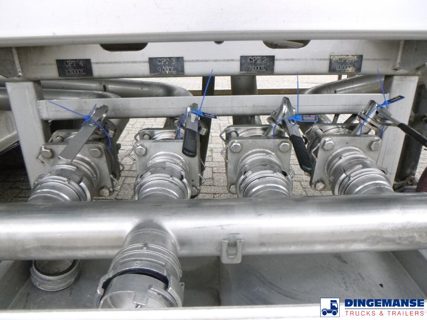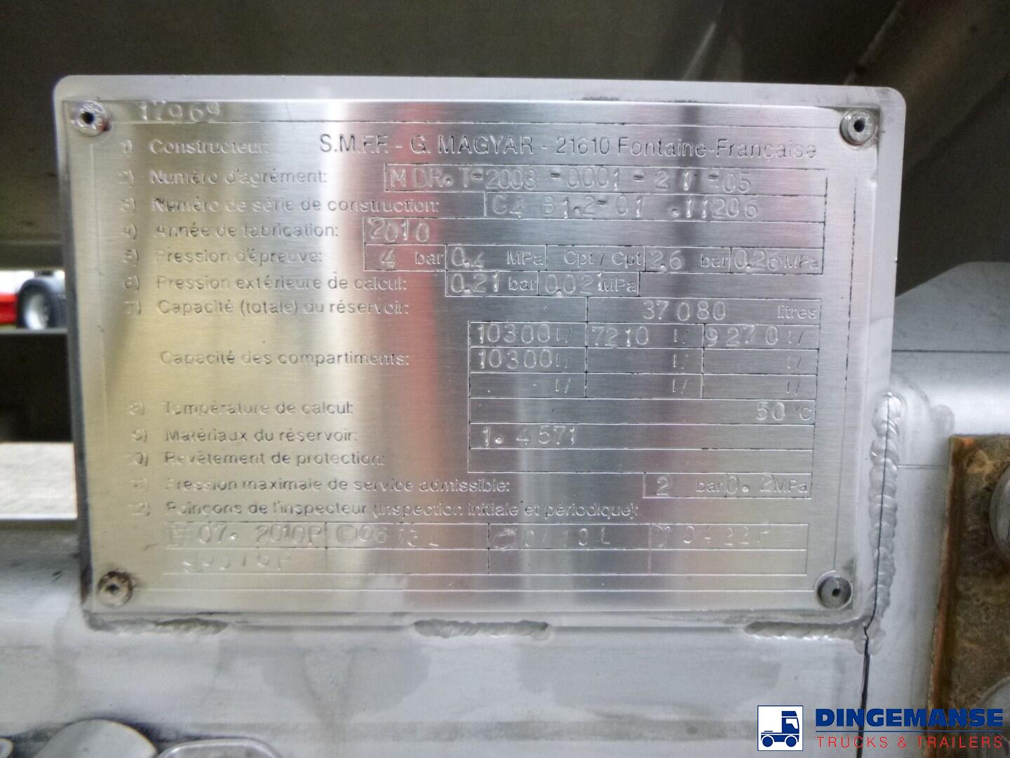 Stainless steel chemical tank, Capacity 37080 liters, 4 Compartment (Net: 10347; 7250; 9271; 10300), Year of construction 2010, Tank material code 1.4571, Test pressure 4.0 bar, Max working pressure 2.0 bar, Air suspension, ABS, Mercedes axles, Disc brakes, Shipment dimensions 1185x250x350 cm