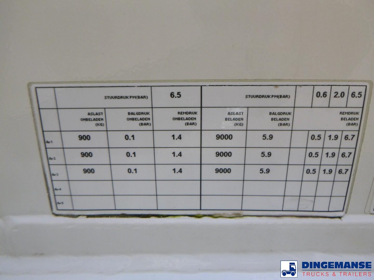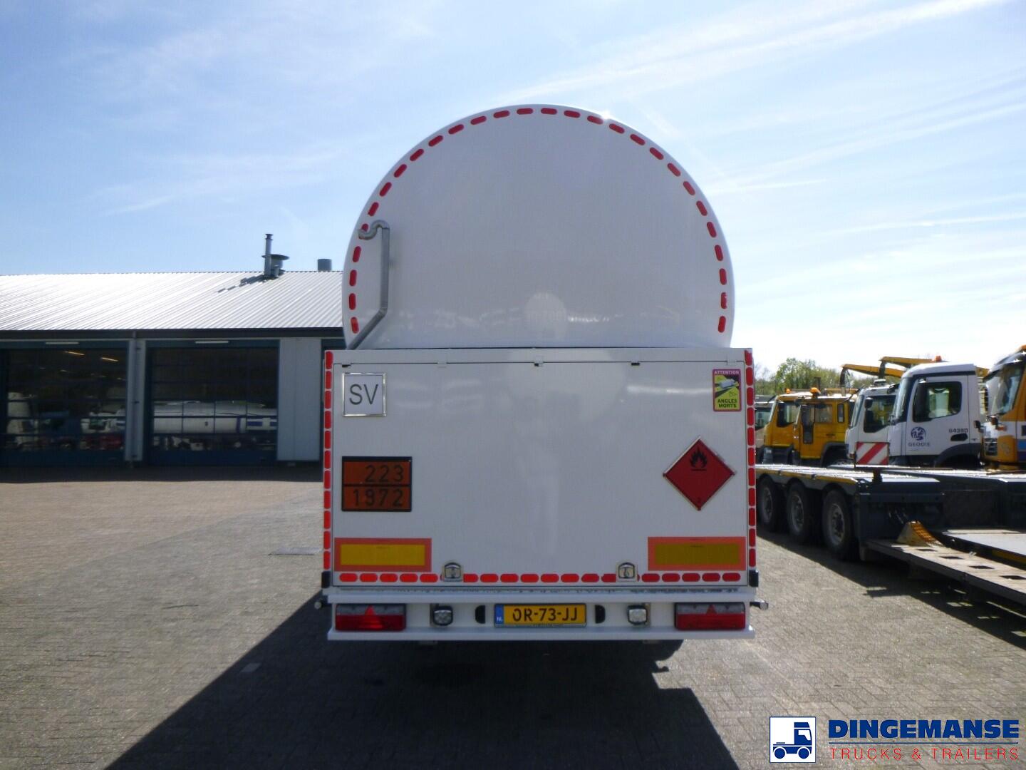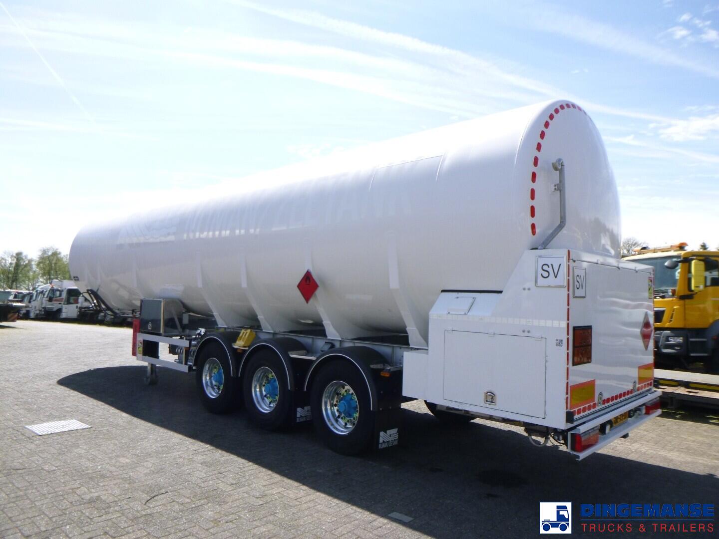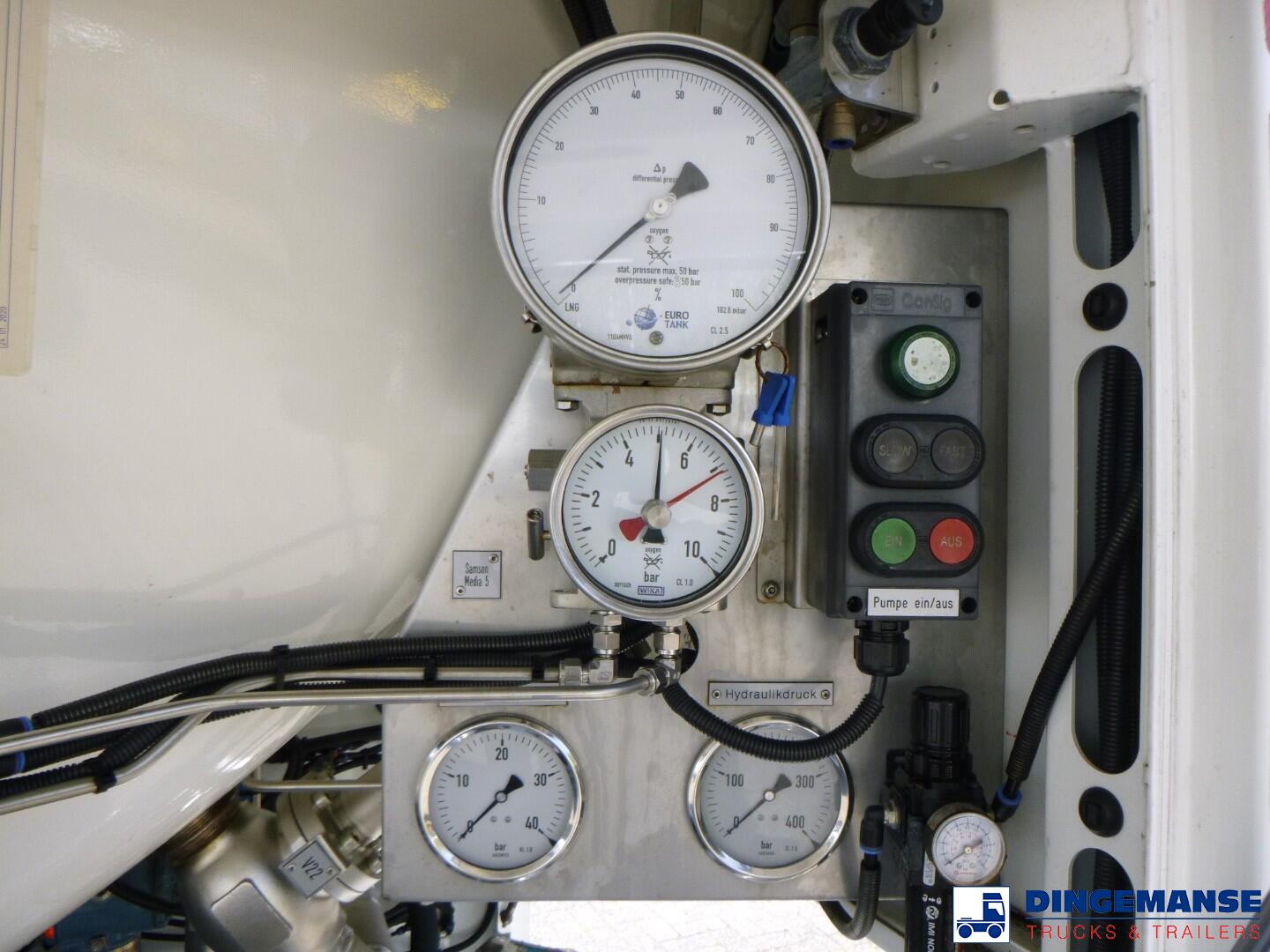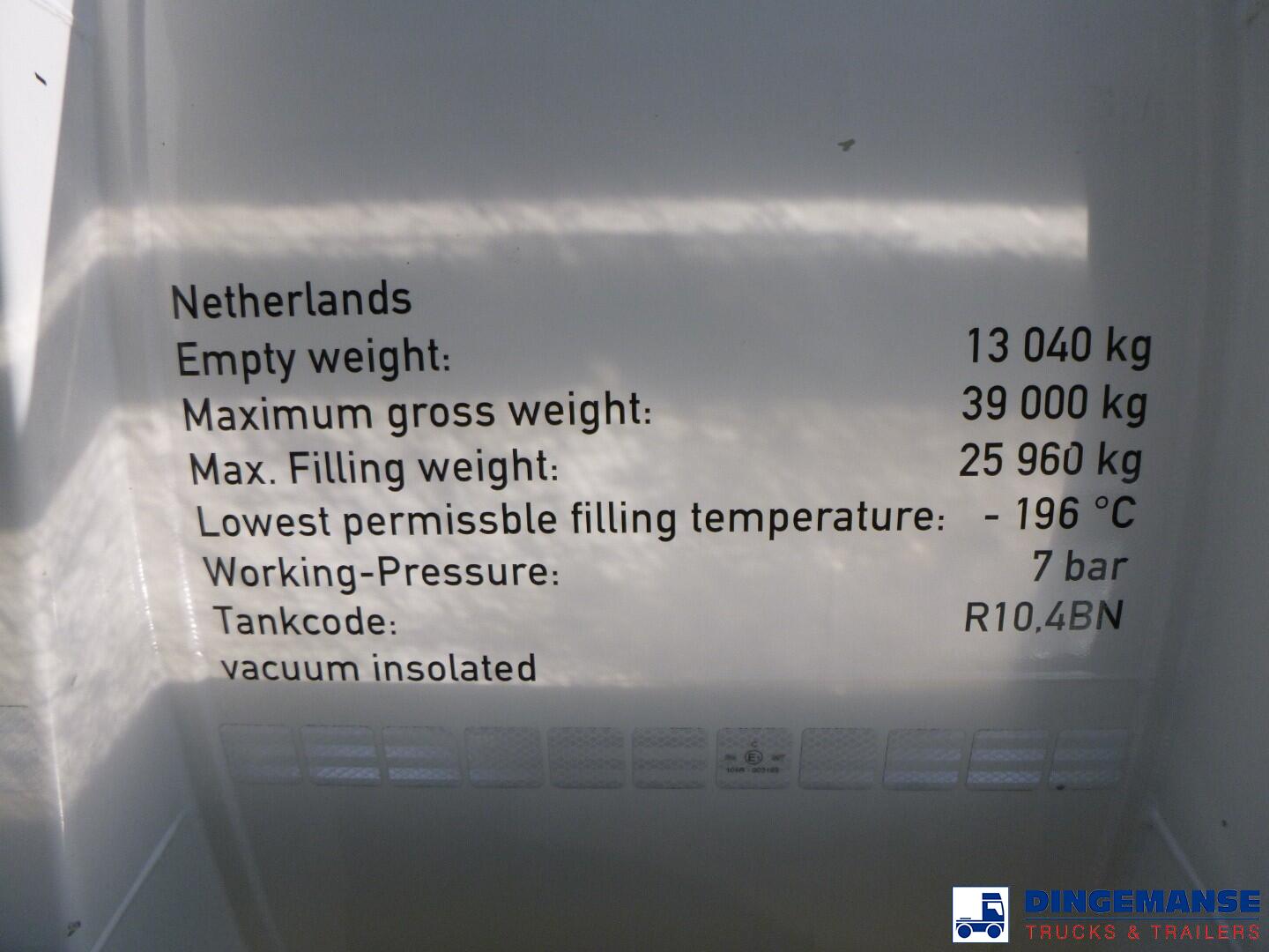 Stainless steel (inox) cryogenic tank, Capacity 58660 liters, 1 compartment, Year of construction 2018, Suitable for UN 1972 (LNG / liquid methane), UN 1977 (liquid nitrogen), UN 1951 (liquid argon), UN 1961 (liquid ethane), Tank material code 1.43111 EN 11028-7, Test pressure 10.4 bar, Max working pressure 7.0 bar, Hydraulic pump, Digital counter, Air suspension, BPW axles, Disc brakes, ABS, Alloy wheels, Shipment dimensions 1260x250x365 cm