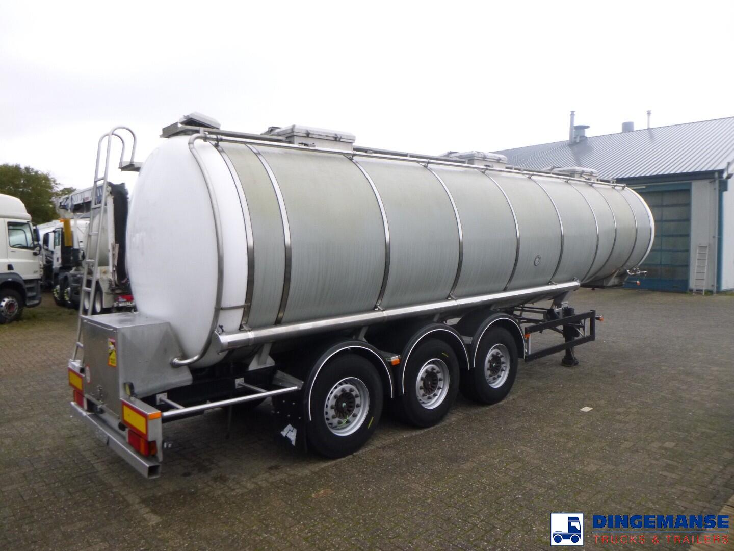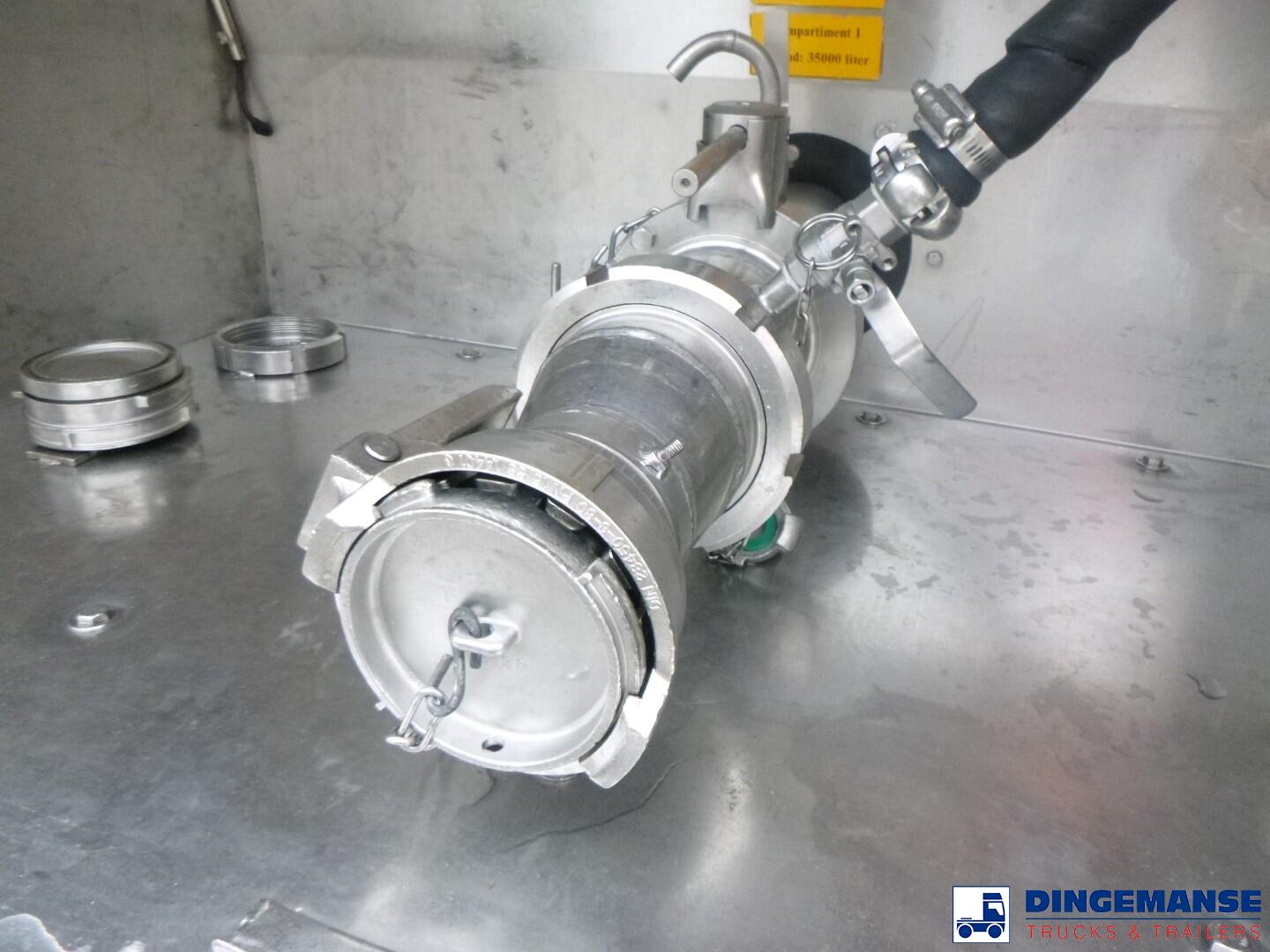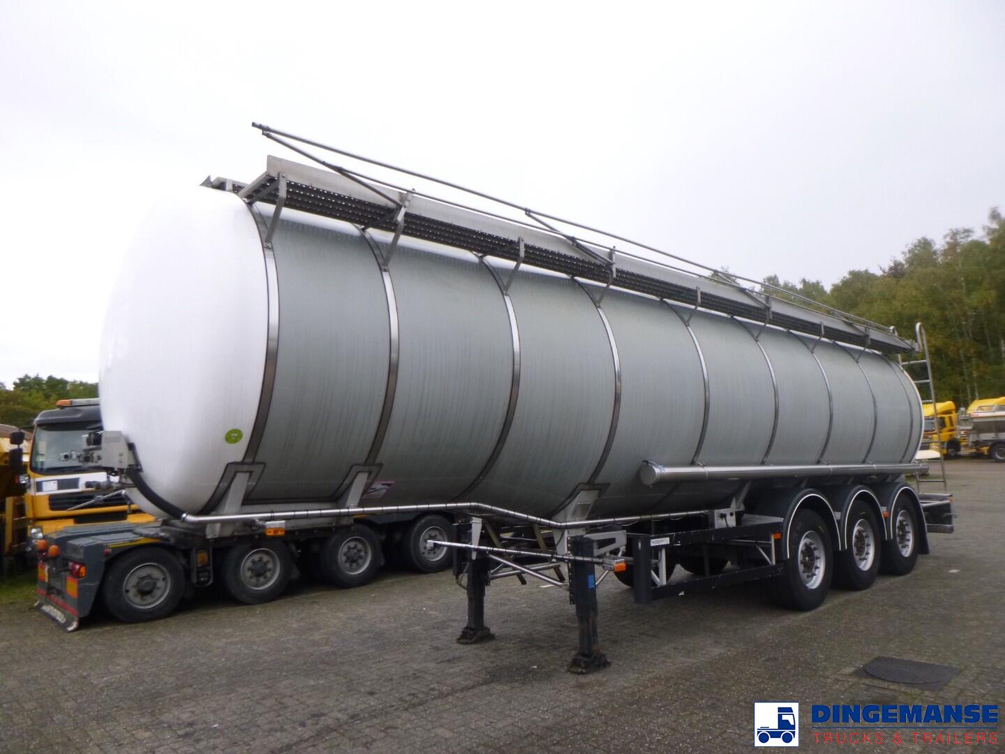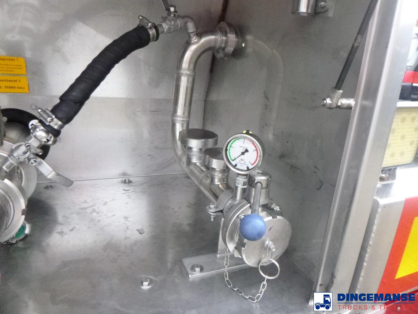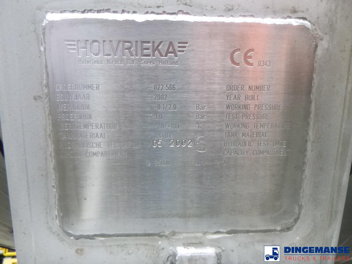 Insulated stainless steel Food tank, Capacity 35000 liters, 1 Compartment, Year of construction 2002, Test pressure 3.0 bar, Max working pressure 2.0 bar, Tank material code 1.4404, Steam heating, Air suspension, Saf axles, Disc brakes, ABS, Shipment dimensions 1120x250x360 cm.
