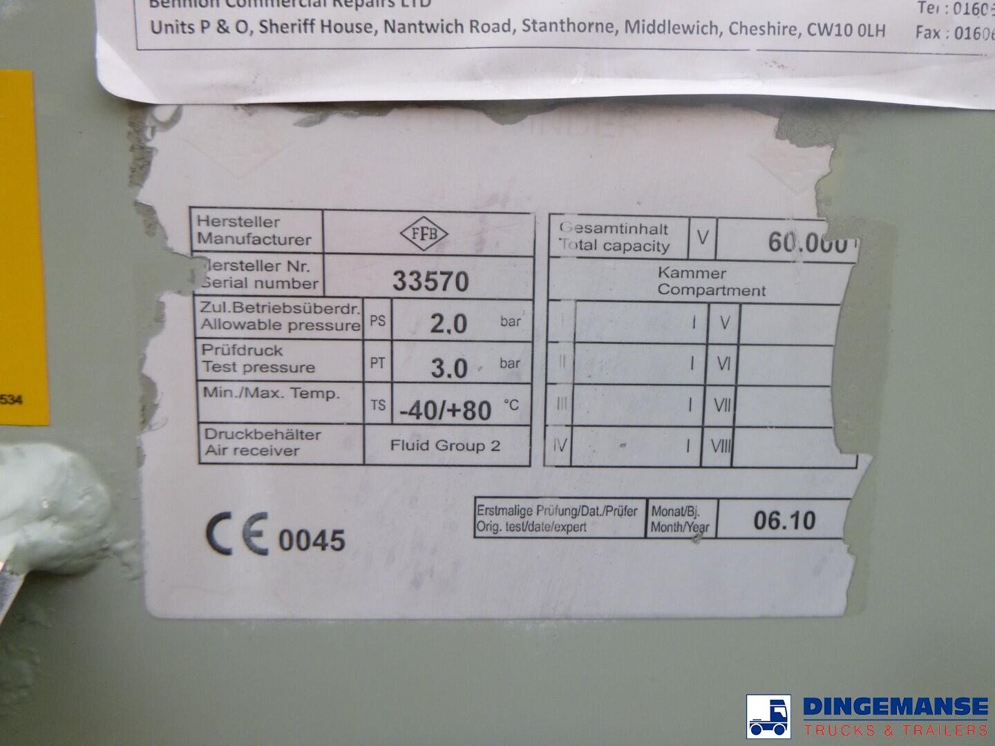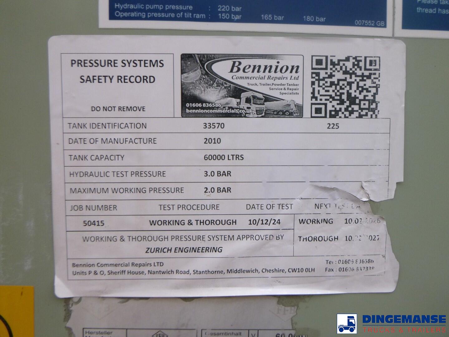 Aluminium tipping powder/bulk tank, Capacity 60000 liters, 1 Compartment, Year of construction chassis 2007, Year of construction tank 2010, Test pressure 3.0 bar, Max working pressure 2.0 bar, Air suspension, BPW Eco Plus axles, Disc brakes, ABS, Alloy wheels, Shipment dimensions: 1300x250x380 cm