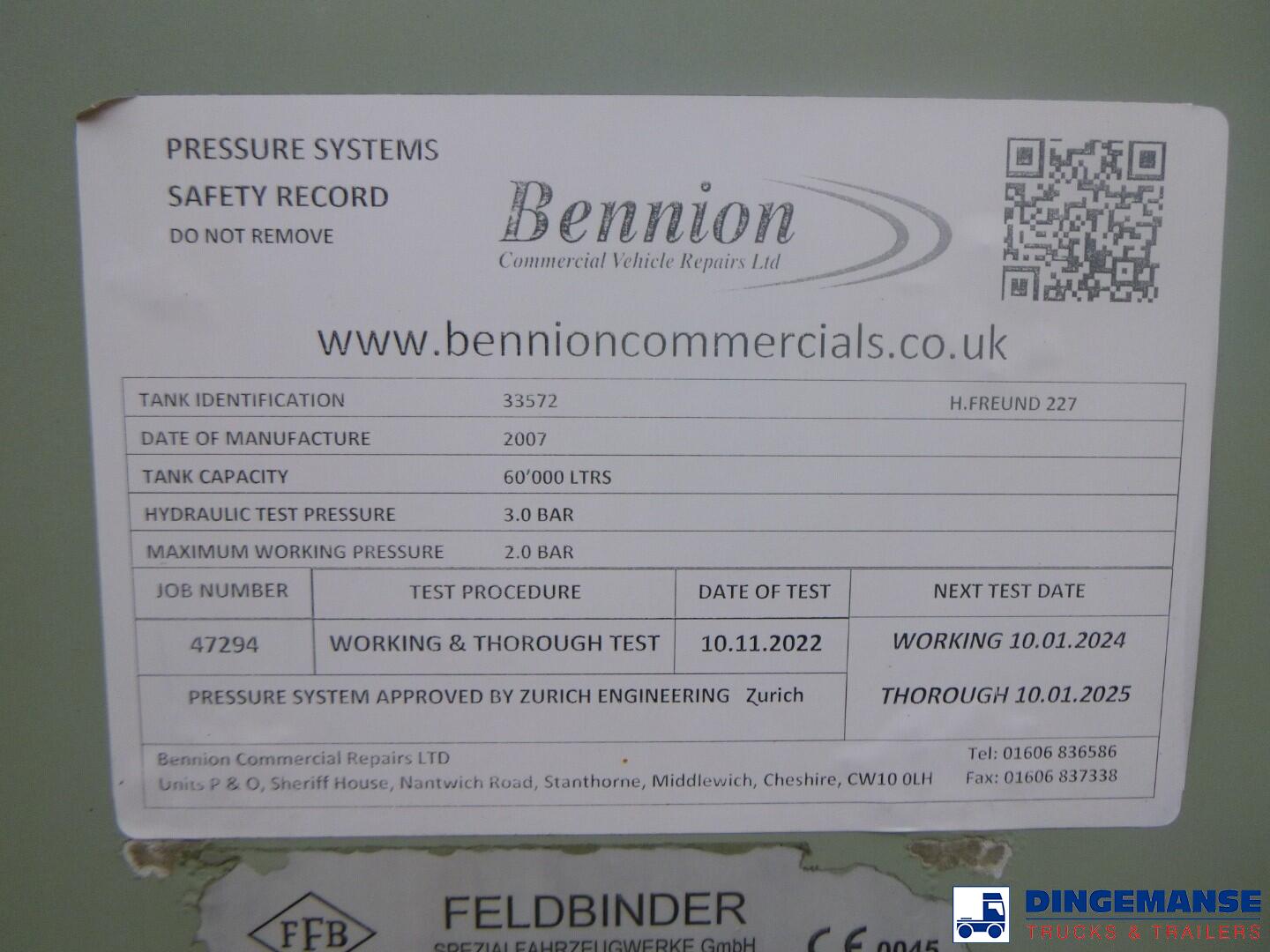 Aluminium tipping powder/bulk tank, Capacity 60000 liters, 1 Compartment, Year of construction 2007, Test pressure 3.0 bar, Max working pressure 2.0 bar, Air suspension, BPW Eco Plus axles, Disc brakes, ABS, Alloy wheels, Shipment dimensions: 1290x250x380 cm