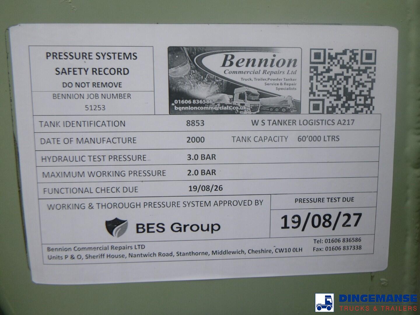 Aluminium powder tank with hydraulic tipping system, Capacity 60000 liters, 1 Compartment, Test pressure 3.0 bar, Working pressure 2.0 bar, SAF axles, Disc brakes, Air suspension, Shipment dimensions: 1280x250x360 cm