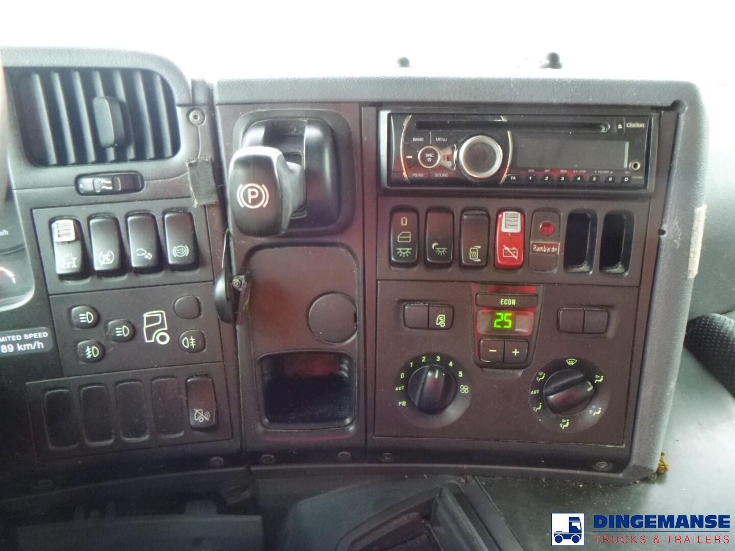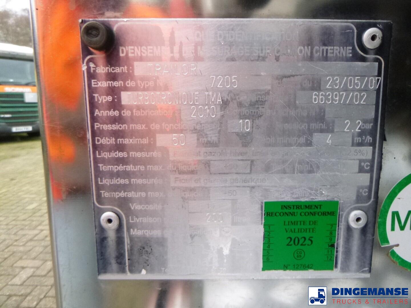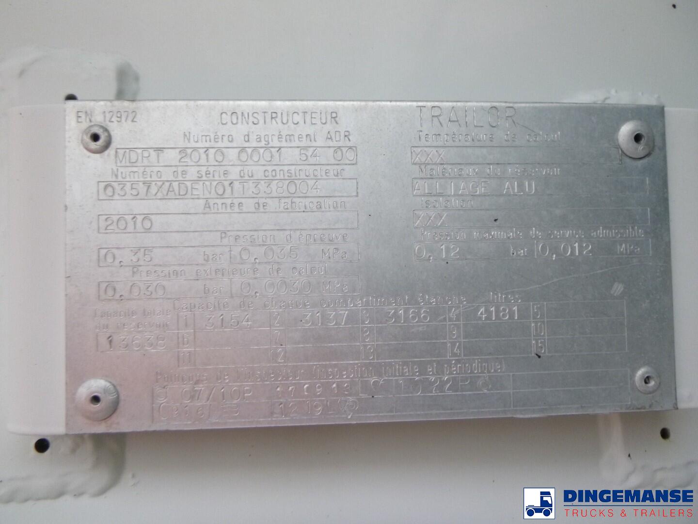 Trailor aluminium fuel tank, Capacity 13638 // 13000 liters, 4 Compartments (3154; 3137; 3166; 4181 // 3000;3000;3000;4000), Year of construction 2010, Test pressure 0.35 bar, Max working pressure 0.12 bar, Hose reel, Hydraulic pump: Mouvex, Digital counter: Alma, Vapour recovery, Overload sensor, Bottom loading // Truck 4x2, Euro 4, Manual gearbox with 8 gears (4 low, 4 high), Diff lock, Front steel suspensions, Rear air suspension, Day cabin, Airconditioning, Digital tachograph, Shipment dimensions 890x250x350 cm