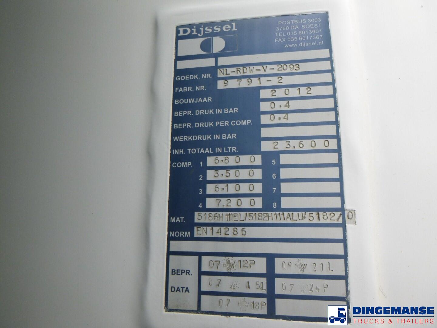 Dijssel aluminium fuel tank, Capacity 23600 liters, 4 Compartments (6800;3500;6100;7200), Year of construction 2012, Test pressure 0.40 bar, Tank material code 14286, Hose reel, Hydraulic discharge pump, Counter, Vapour recovery, Overload sensor // Truck 6x2, Euro 5, Adblue,Automatic gearbox, Diff lock, Full air suspension, 3rd axle lift and steering axle, Alloy wheels, Sleep cabin, 1 bed, Night heater, Airconditioning, Digital tachograph, Shipment dimensions 880x240x340 cm